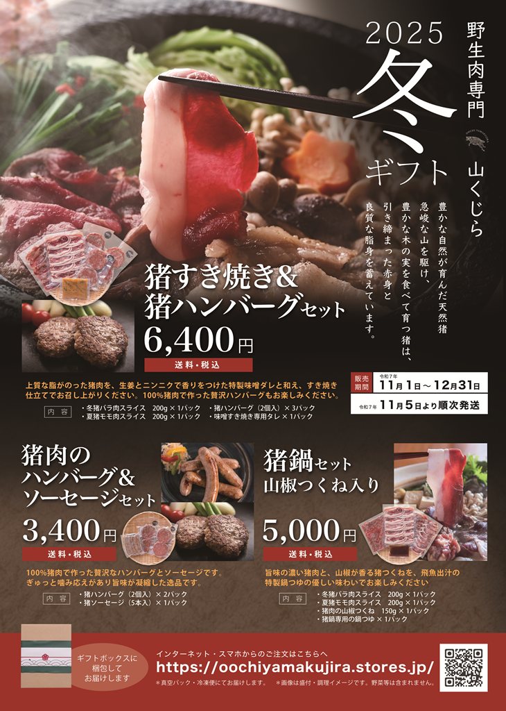 毎年人気の「送料無料・冬ギフトセット」が始まりました。定番の猪鍋セットや味噌すき焼きに加え、ハンバーグ&ソーセージの詰め合わせもご用意。ギフトはもちろん、ご自宅用の“お味見”にもおすすめです!